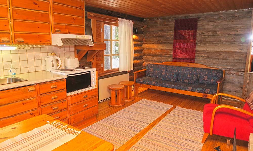Piilopirtti Log Cabin is located on the best spot, next to the starting point of Pieni Karhunkierros Trail. There are beds for two, and extra beds for two. There are bunk beds in the bedroom and a single bed that pulls out into a double in the living room. The cabin has open-plan kitchen-living room and a sauna with electric stove.