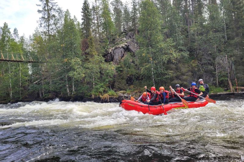 Myllykosken jälkeen laskemme retken suurimman kosken. Vuorossa on klassikko: Aallokkokoski! Tämä melkein 900 metriä pitkä IV-luokan koski putoaa 21 metriä, joten vauhtia riittää. Melojien tekevät saumatonta yhteistyötä kipparin ohjeiden mukaan ja halkovat Aallokkokoskelle tyypillisiä heinäsuova-aaltoja. Onnistumisen tunne tämän vauhdikkaan kosken jälkeen on upea!