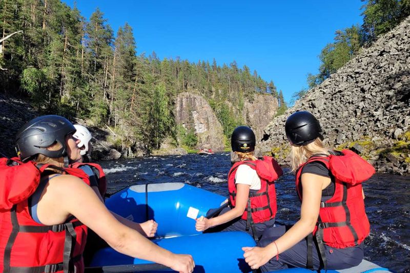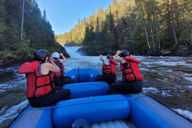 Koskenlaskun hinta sisältää retkieväät, varusteet (kumisaappaat, sadehousut ja -takki, pelastusliivi, kypärä), kuljetukset takaisin kokoontumispaikkaan, koskenlaskukipparitutkinnon suorittaneen oppaan, kumilautan ja melat, vakuutukset.